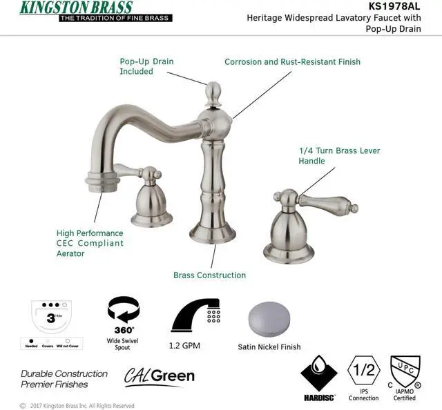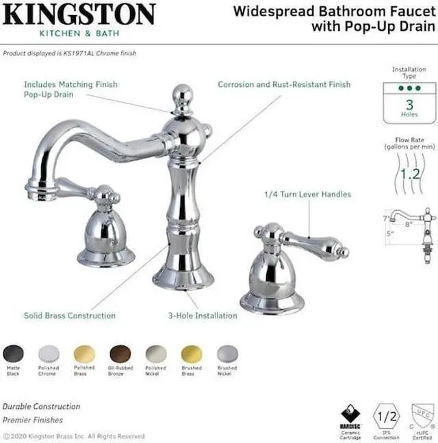Two Handle 8" to 16" Widespread Lavatory Faucet with Retail Pop-upTwo Handle Deck Mount, 3 Hole Sink Application, 8" to 16" Widespread, Fabricated from solid brass material for durability and reliability, Premium color finish resists tarnishing and corrosion, 1/4 turn On/Off water control mechanism, 1/2" IPS male threaded inlets with rigid copper piping, Duraseal washerless cartridge, 2.2 GPM (8.3 LPM) Max at 60 PSI, Integrated removable aerator, 5-3/4" spout reach from faucet body, 4" overall height.Designed for a lifetime of performanceMeets ASME A112.18.1, ANSI/NSF 61 Sec. 9 codeAll mounting hardware includedMatching accessories availableCollection/Series: VictorianFinish: Polished Chrome/Polished BrassTheme: Classic