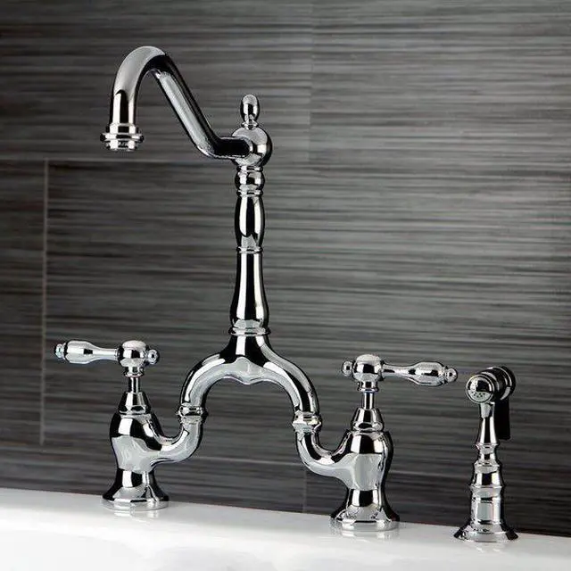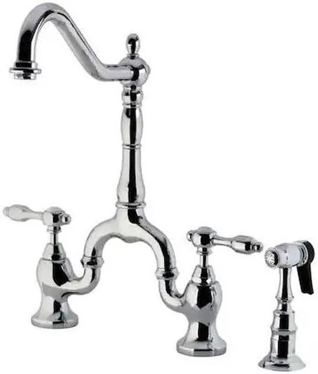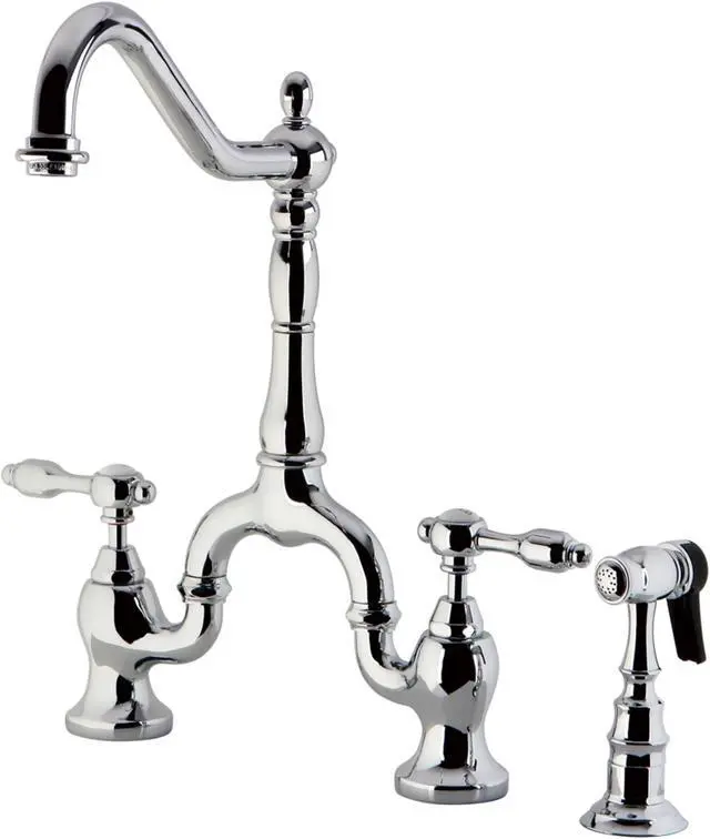 California Proposition 65: This product contains a chemical known to the State of California to cause birth defects or other reproductive harm. Offering a nod toward the past, this faucet is beautifully inspired by the vintage elegance of mid-19th Century design. Whether you are striving for a Victorian-inspired kitchen or a vibrant 1950s-themed space, the unique bridge design is a highly favored option amongst those doing period-style kitchens. Because of its added architectural elements and detailing, the polished chrome finish will pop against your surrounding kitchen decor. Allow the brass construction, side sprayer, and swivel abilities to provide a sturdy and reliant fixture, great for use with any sink.