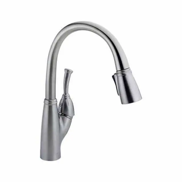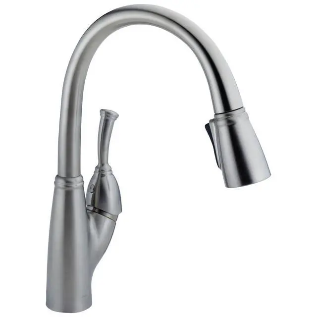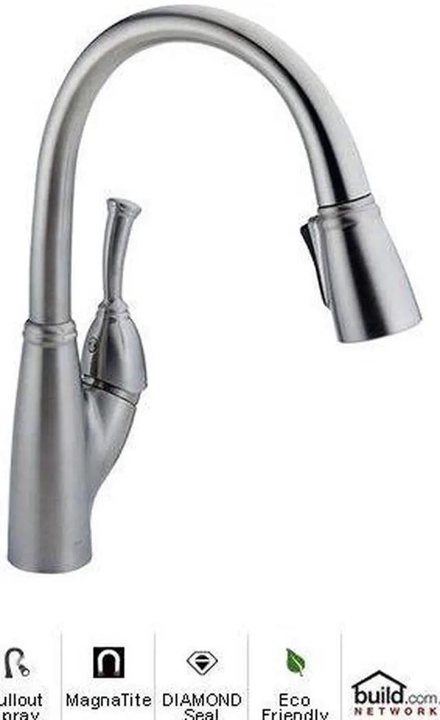 Product Features: Made in the U.S.A. (Manufacturing plants: Greensburg, Indiana; Jackson, Tennessee) Fully covered under Delta's limited lifetime warranty All-brass faucet body and handle construction Superior finishing process - faucet finish covered under lifetime warranty Includes cover plate (escutcheon) for sinks with 3-holes (8" centers) Insulated pullout spray faucet head with 59" hose The Allora pull-down and coordinating bar/prep capture a country sophisticate flavor Designed with the hints of the watering can inspiration Spout swivels 360 degrees to allow for unobstructed sink access High-arch gooseneck spout further allows for unobstructed sink access Product Technologies: MagnaTite Docking: Delta's patented MagnaTite Docking Technology uses a powerful integrated magnet to securely hold your Delta kitchen faucet's pull-down spray in place when not in use. A light tug releases the wand for total flexibility and a full range of motion. When docking the wand after use, the MagnaTite Docking mechanism will guide the spray securely back into place. Diamond Seal: Delta DIAMOND Seal Technology utilizes a ceramic disc valve with a real diamond coating to produce a faucet that will last up to 5 million uses. That's an amazing 10 times the industry standard, guaranteeing a lifetime of leak-free, trouble-free performance. Eco Friendly: Through a number of technologies and innovations, Delta’s Eco Friendly faucets achieve the impossible: A faucet that feels like more water, while actually conserving water. There are many advantages to this beyond helping protect our nation’s water resources. First, Delta’s Eco Friendly faucets splash less; you won’t have to wipe your counters as much. Second, they use less hot water, preserving your hot water supply and reducing associated water-heating costs. Third, you will feel a little less guilty leaving the water running for longer periods. Touch Clean: Only Delta offers faucets equipped with Touch Clean soft, rubber nubbins (spray holes) that allow you to easily wipe away calcium and lime build-up with the touch of a finger. This is particularly helpful for areas with hard water. Product Specifications: Overall Height: 15-4/7" (measured from counter top to highest point of faucet) Spout Height: 7-3/4" (measured from counter top to faucet outlet) Spout Reach: 9-7/8" (measured from center of faucet base to center of faucet outlet) Number of installation holes required: 1 2.2 gallons-per-minute flow rate Installs onto decks up to 2-1/2" thick 1 handle included ADA compliant Low lead compliant - complies with federal and state regulations for lead content Designed to easily connect to standard U.S. plumbing supply bibs Extra secure mounting assembly All necessary mounting hardware included Variations: 989-DST: this model 999-DST: this model without Touch Clean technology About Delta: Delta is more than just a brand of kitchen and bathroom faucets. It’s a name that represents what’s possible in today’s plumbing technologies. Every kitchen and bathroom in every home is unique, and with a wide range of pricing and features, Delta faucets and fixtures can meet every need. Delta is driven by its quest for innovation—and this applies to its kitchen and bathroom faucets and fixtures. From Touch2O technology (which turns the faucet on and off with just a touch) and MagnaTite technology (which eliminates droopy pull-down spray heads), to H2Okinetic showers (for a warmer and more luxurious shower experience), your life is simplified through innovations. And if you’re searching for a product to offer an eye-catching focal point, while providing durability and reliability for a lifetime, look no further than Delta. From extremely affordable and reliable faucets to fully loaded fixtures featuring today’s leading technologies, Delta has a faucet for everyone.