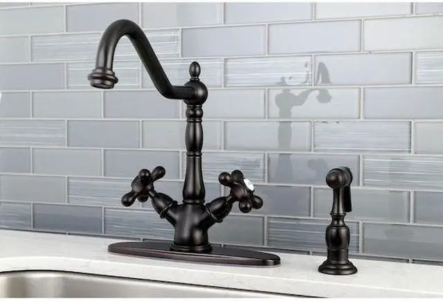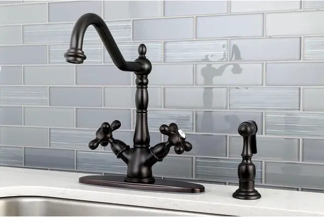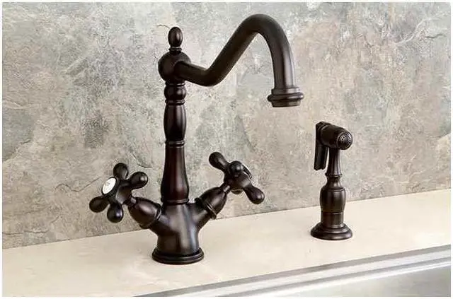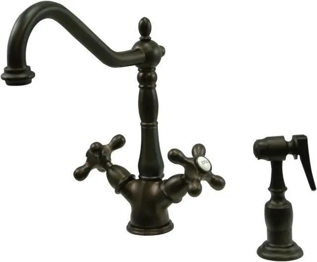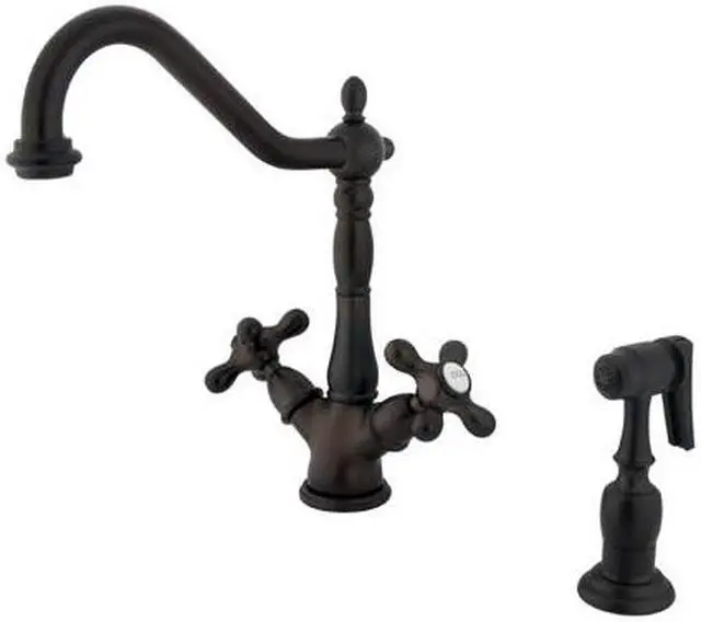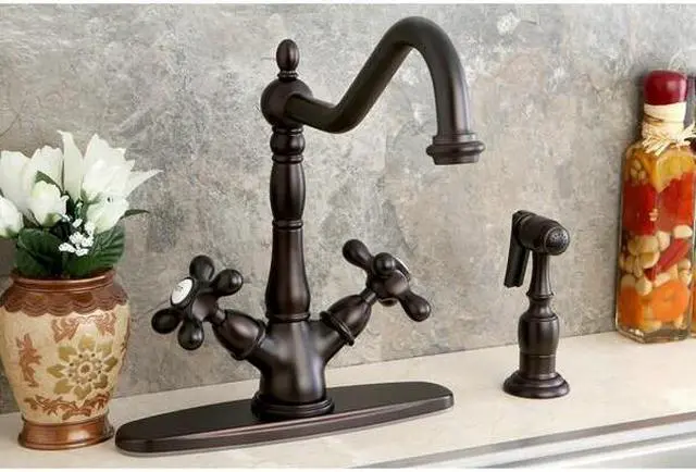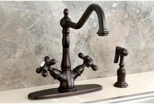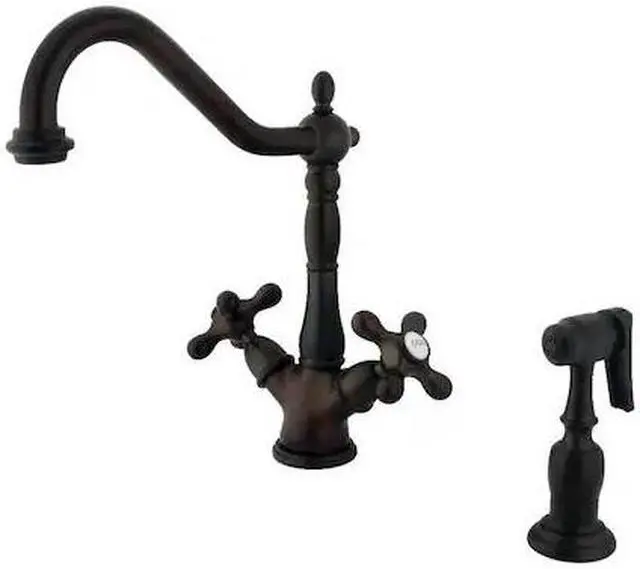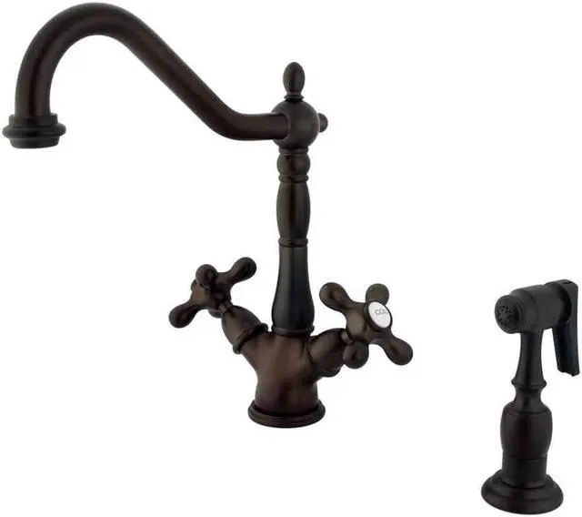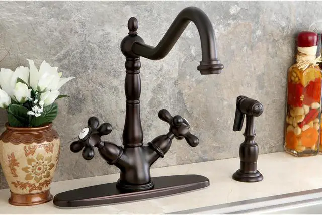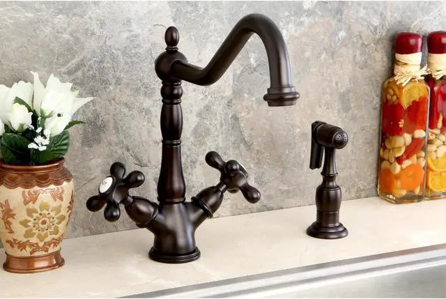 California Proposition 65: This product contains a chemical known to the State of California to cause birth defects or other reproductive harm. A lavish spark of traditionally stylized glamour is brought to your kitchen ensemble with this beautiful faucet. For a streamlined yet glamorous look, two-handle single-hole kitchen faucets are a practical and fashionable design. Additionally, the oil rubbed bronze finish is guaranteed to embellish your home's traditional ensemble for years to come as it adds a warmer tone. Allow the brass construction to provide a sturdy and reliant fixture. Utilize the included matching finish side-sprayer for convenience in cleaning hard-to-reach areas.