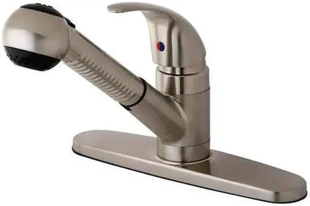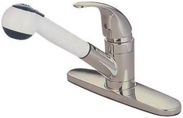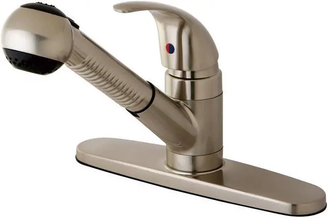 California Proposition 65: This product contains a chemical known to the State of California to cause birth defects or other reproductive harm. A twist on classic design is taken with this faucets curved features. An excellent options for smaller kitchens, the angled spout and extendable hose reach provide an optimized use of space. Minimalist design along with a classic style help you tackle your tough messes with the Legacy Single-Handle Pull-Out Kitchen Faucet's two-function sprayer. The brass construction and single handle also provide a sturdy, reliant, and easy to use fixture. Matching accessories are available for use.