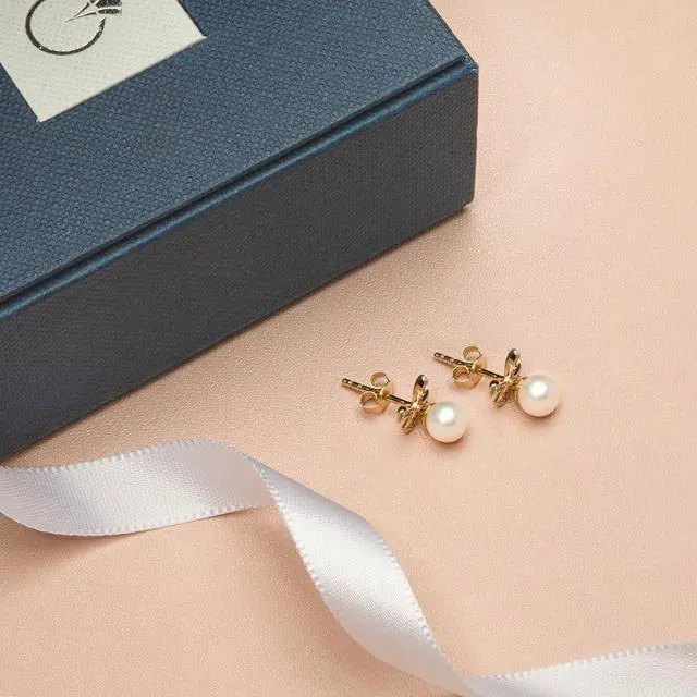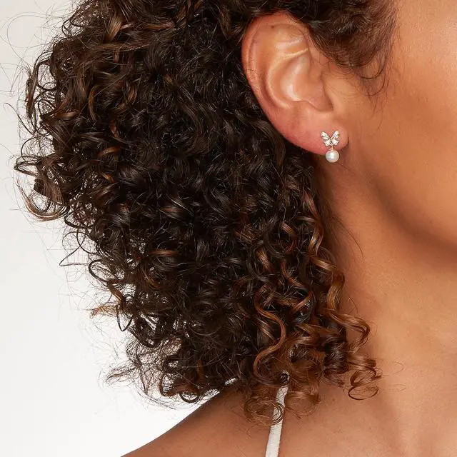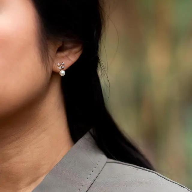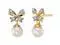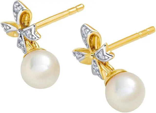 These bow-tie Pearl and gold dangle earrings from Oravo are simply sophisticated. These yellow gold earrings feature Round Shaped Freshwater Cultured White Pearls, 5mm each with AAA Quality Grade. An embellished bow crowned at the top is pretty and adds a flirty fun twist. Freshwater Cultured Pearls are real pearls with thick iridescent nacre hand-polished for a pearlescent sheen. These dainty earrings measure 1/2 x 1/4 inch.