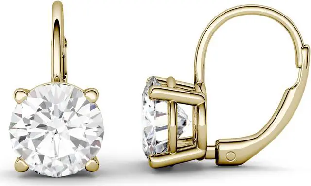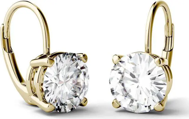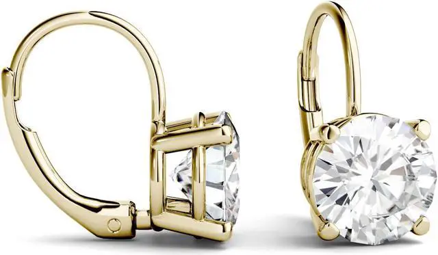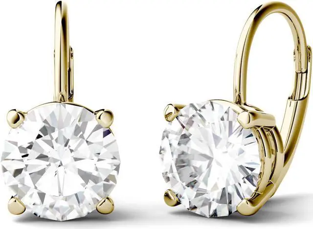 These glamorous Moissanite by Charles & Colvard drop earrings showcase 7.5mm round brilliant cut moissanite gemstones. Beautifully crafted in 14K yellow gold and secured in a four-prong setting. Each 7.5mm moissanite gemstone has a Diamond Equivalent Weight (DEW) of 1.50ct (Actual Weight 1.35ct). The pair of earrings has a total Diamond Equivalent Weight (DEW) of 3.00cttw (Actual Weight 2.70cttw).