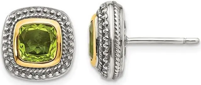 Antiqued style peridot gemstone earrings the birthstone for August, crafted in sleek sterling silver and highlighted by 14K yellow gold accents.