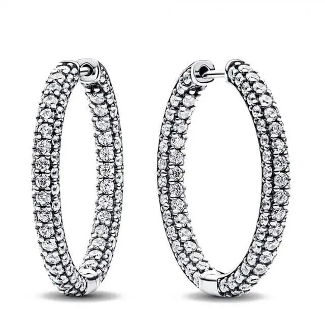 Classic hoops get a sparkling update in the Pandora Timeless pave Single-row Hoop Earrings. These sterling silver hoop earrings feature a D-shaped profile covered in pave. Set with 198 round bead-set stones these hoops will make any look shine. Peek inside to see the iconic Pandora logo engraved on the hoops interior. Elevate your day-to-day style with these statement hoops or pair them with other sparkling pieces for a high-impact evening look.