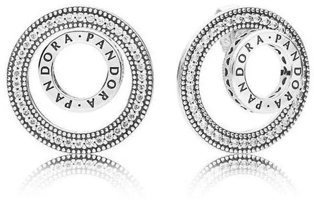 This two-piece stud earrings feature a PANDORA logo on the front circle and sparkling stones on the back circle adding dazzle to the two-dimensional graphic design