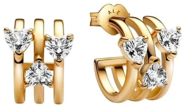 Celebrate love and individuality with these contemporary sparkling hoops. Made from our 14k gold-plated unique metal blend these earrings feature six heart-cut cubic zirconia that overlap in a dynamic silhouette. A trio of lines are decorated with a smattering of hearts. Perfect for adding romantic sparkle to your jewelry these earrings are versatile enough for any occasion.