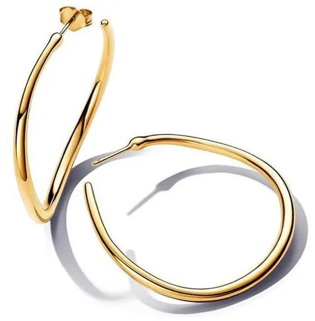 Play with linear curves when you wear the Organically Shaped 42 mm Open Hoop Earrings. This 14k gold-plated set features slightly wavy open hoops with a rounded profile and varying thickness. The result is a delicate fluid and organic look evoking the ebbs and flows that can be found in nature. This earring set is a must-have addition to any hoop lovers collection whether thats you or a stylish loved one.