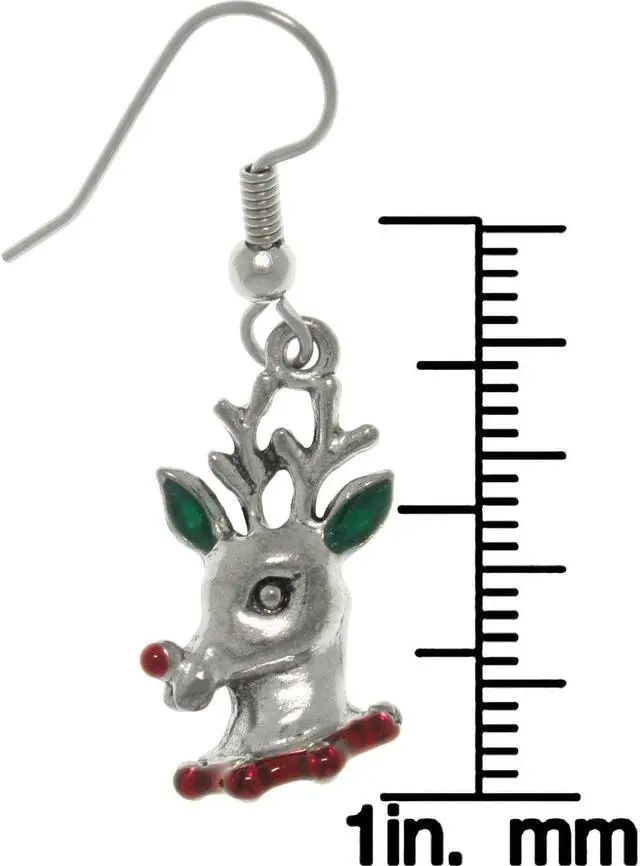 Decorate your ears for the holidays with this pair of adorable red-nosed reindeer earrings featuring red and green epoxy. These earrings are made of pewter alloy and attach with hook findings.