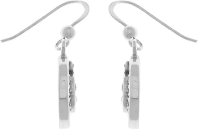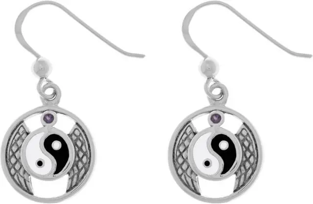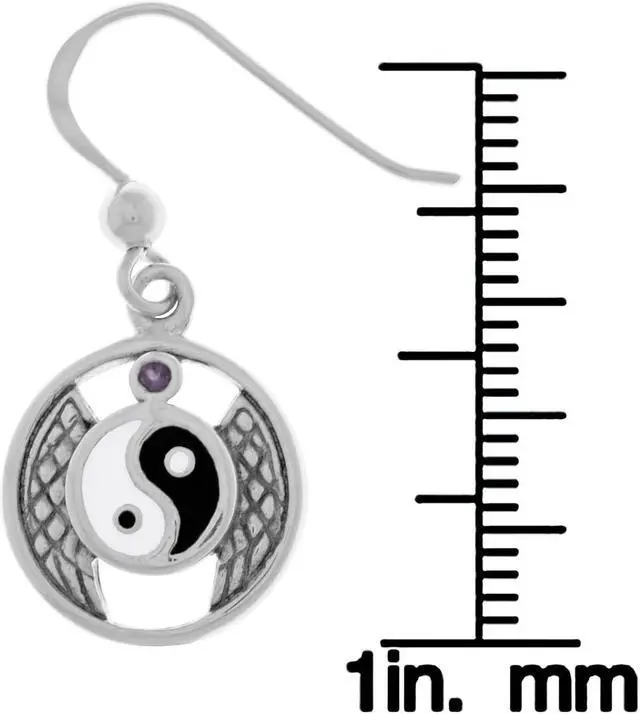 Crafted of highly polished .925 Sterling Silver, this pair of earrings showcases a winged Yin Yang design. Each Yin Yang balance symbol is accented with Black and White Enamel and is topped with a petite genuine Purple Amethyst. Earrings dangle from hook findings. Peter Stone© Jewelry Designs are exclusive and protected by Copyright Laws.