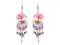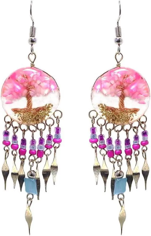 Handmade round-shaped clear acrylic resin, copper wire, and crushed chip stone inlay tree of life dangle earrings with long seed bead, chip stone, and alpaca silver metal dangles in pink, purple, light blue, and hot pink color combination.