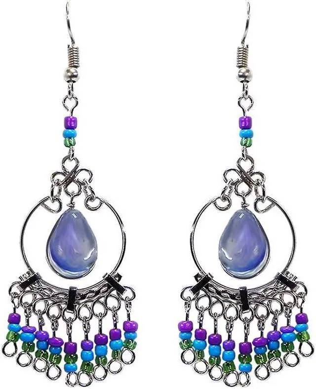 Handmade teardrop-shaped glass bead cat's eye silver metal hoop earrings with seed bead and alpaca silver metal dangles in purple, turquoise blue, and green color combination.