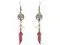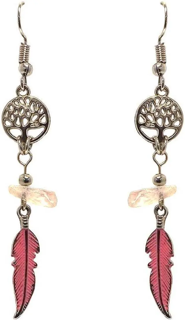Handmade silver metal tree of life charm earrings with chip stone and colored metal feather charm dangle in pink color.