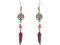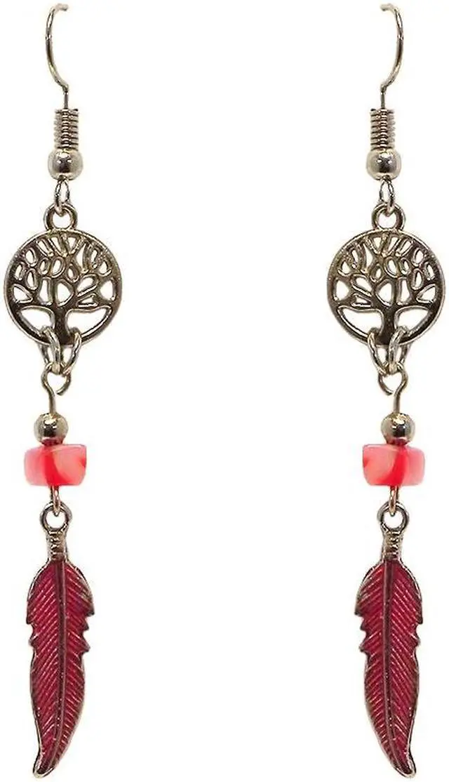 Handmade silver metal tree of life charm earrings with chip stone and colored metal feather charm dangle in red color.