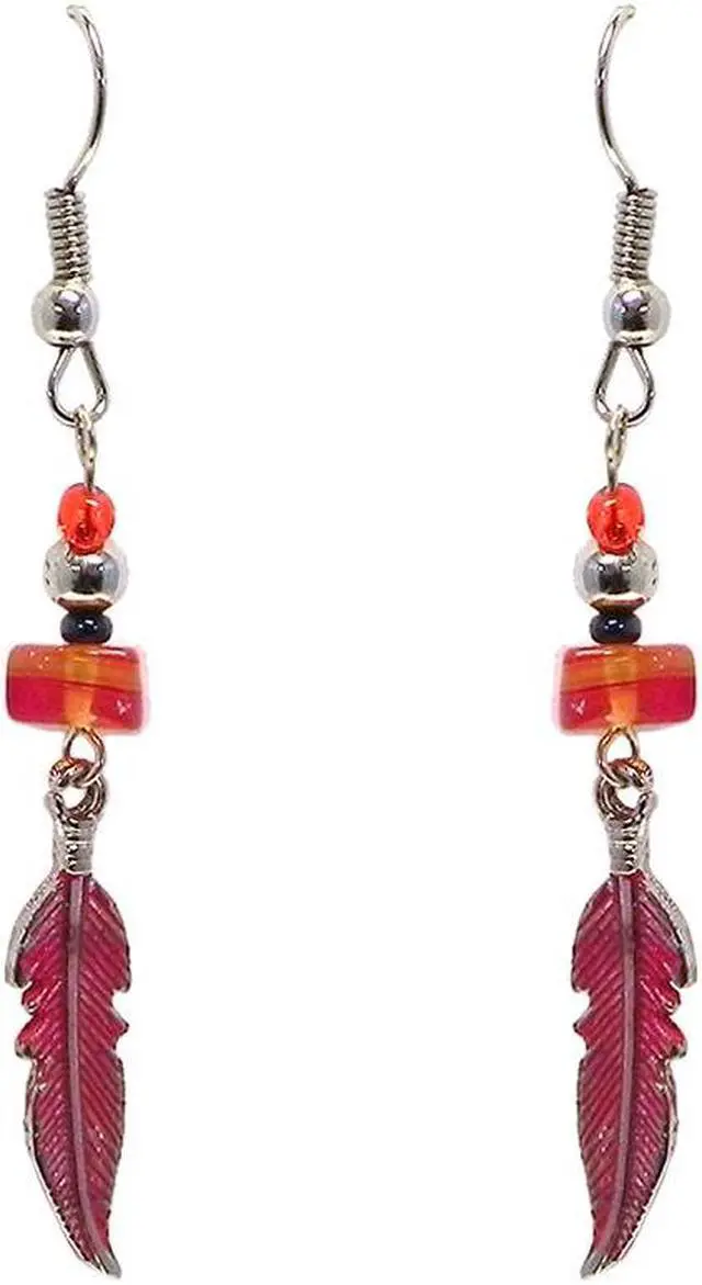 Colored Metal Feather Charm Chip Stone Drop Dangle Earrings - Womens Southwest Fashion Handmade Jewelry Boho Accessories