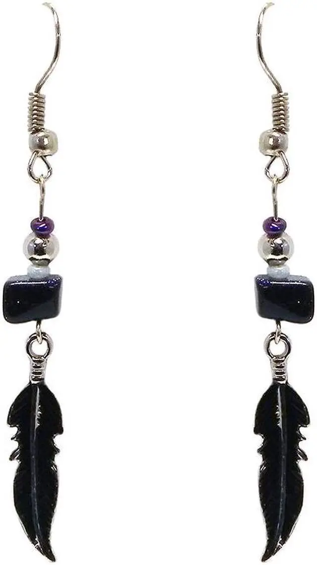 Handmade colored metal feather charm dangle earrings with chip stone in black and dark blue goldstone color combination.