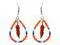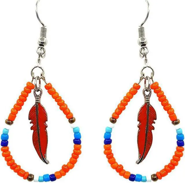 Teardrop-shaped seed bead hoop earrings with colored metal feather charm inner dangle in Native American inspired color combination.