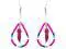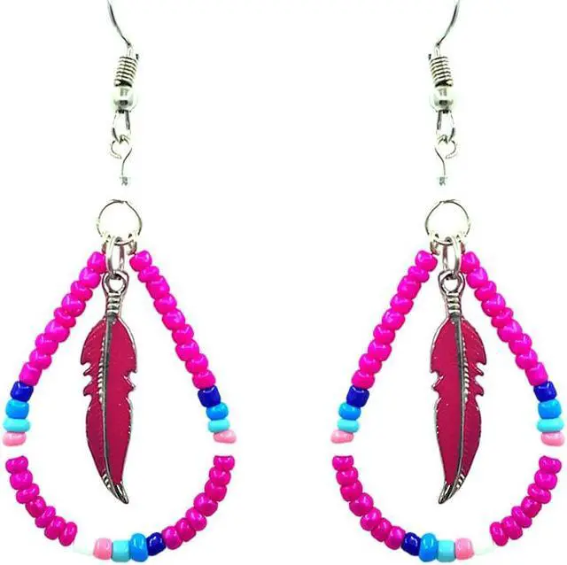 Handmade Native American inspired teardrop-shaped seed bead hoop earrings with colored metal feather charm inner dangle in hot pink, blue, turquoise, light blue, pink, and white color combination.