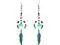 Handmade Native American inspired teardrop-shaped seed bead and chip stone earrings with colored metal feather charm dangle in mint green, brown, whiite, and black color combination.