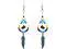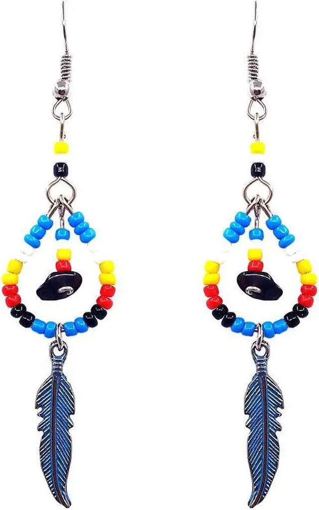 Handmade Native American inspired teardrop-shaped seed bead and chip stone earrings with colored metal feather charm dangle in turquoise blue, yellow, red, white, and black color combination.