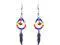 Teardrop-shaped seed bead and chip stone earrings with colored metal feather charm dangle in Native American inspired color combination.