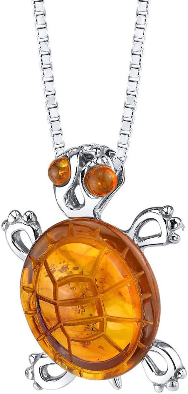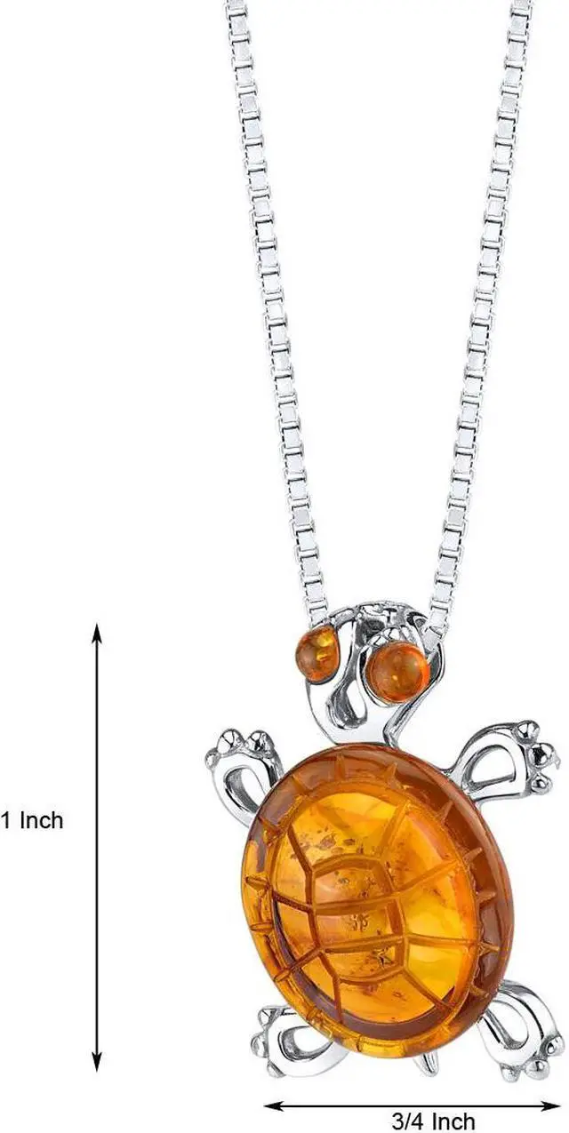 Genuine Baltic Amber, Rich Cognac Color, turtle shape. Pendant: 3.00 grams pure 925 sterling silver, Includes 18 inch Sterling Silver Box Chain Necklace. Dimensions: 1 inch x 3/4 inch. Pendant features exceptional design, craftsmanship and finishing. Perfect gift for Mothers Day, Birthdays, Valentines Day, Graduation, Christmas or just about any other occasion. Includes a Signature Gift Box. Style SP11350