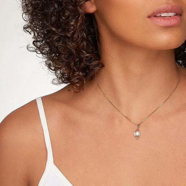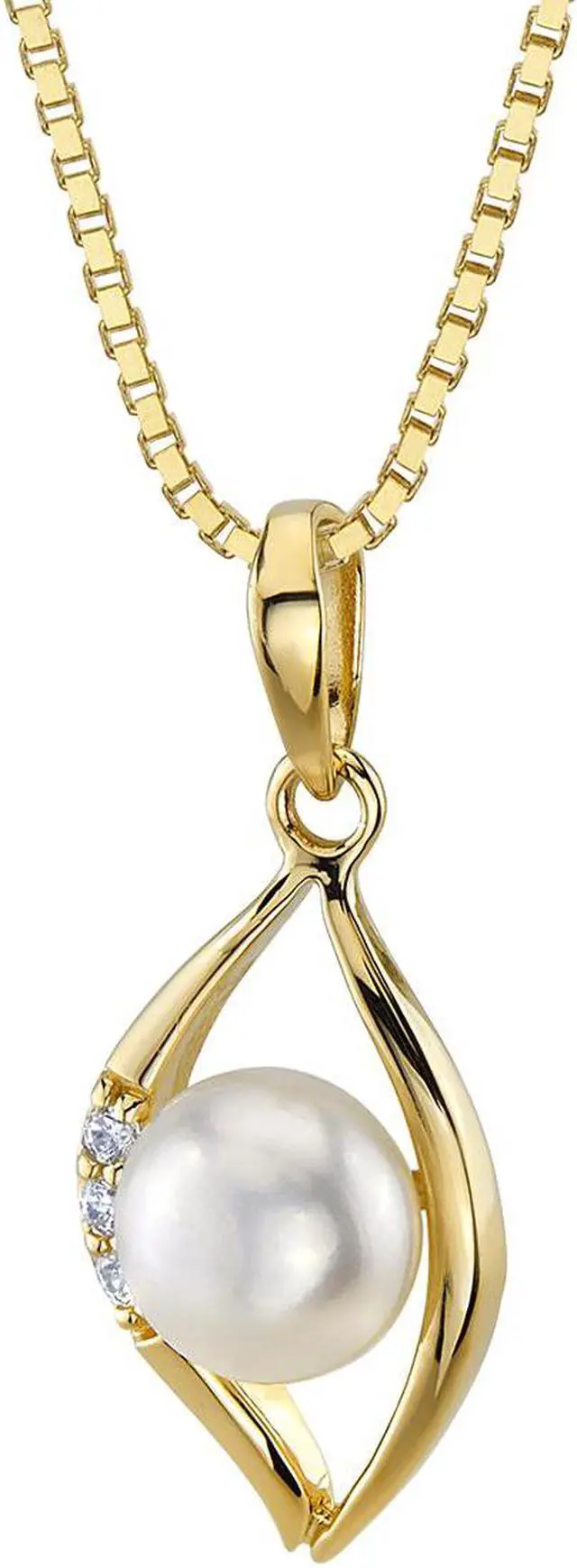 This 14K Yellow Gold Pearl pendant from Oravo features a Freshwater Cultured White Pearl with smooth a round button shape. The Pearl measures 6mm and has a AAA quality grade. Freshwater Cultured Pearls are real pearls with thick iridescent nacre hand-polished for a pearlescent sheen. This pendant measures 7/8 x 3/8 inch. This pendant is delicately accented with sparkling Cubic Zirconia stones for added luxury. Crafted in durable and hypoallergenic 0.58 grams of polished 14K Yellow Gold, this Freshwater Cultured Pearl pendant is ready to wear with a complimentary 18 inch Yellow Tone Sterling Silver chain secured by a spring ring clasp.