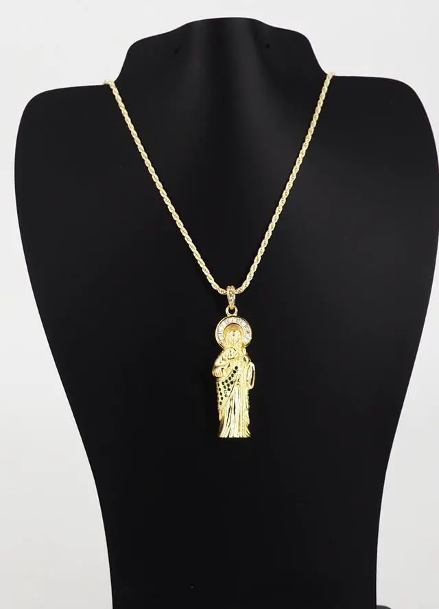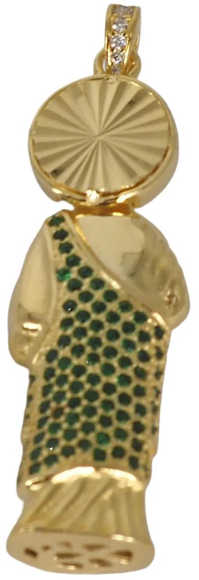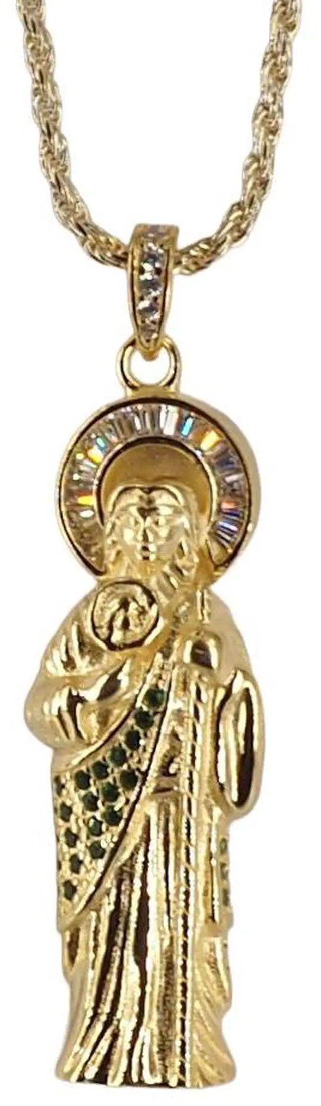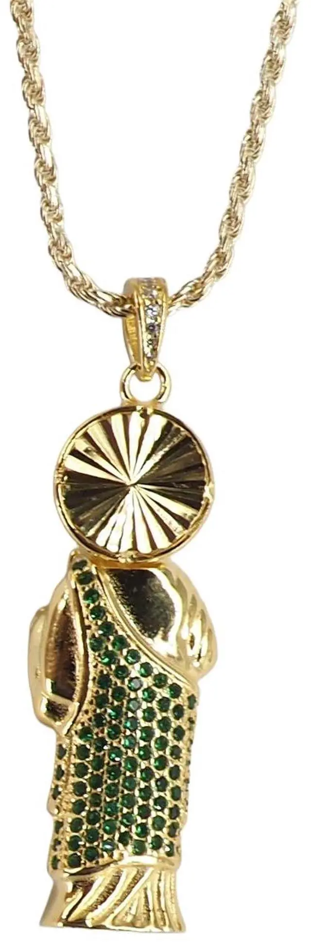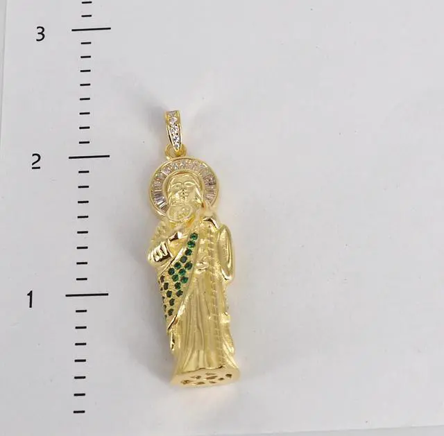 MST 925 Sterling Silver 14K Gold-Plated San Judas (Saint Jude) 3D Pendant Necklace with Green Emerald & Baguette CZ, Made in Italy, Unisex, All Ages