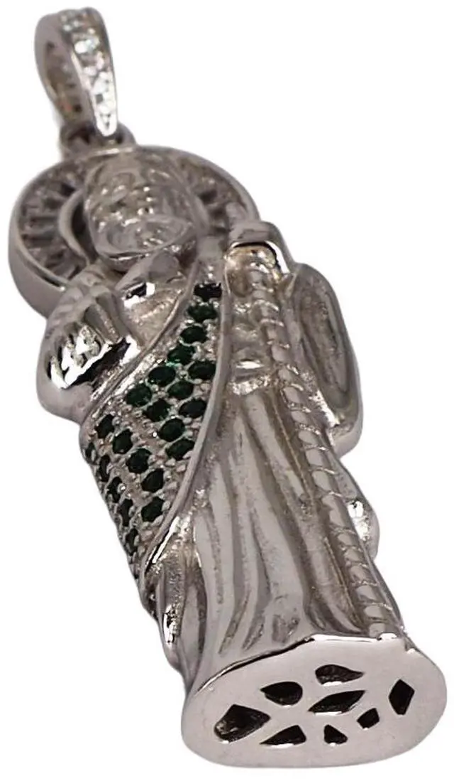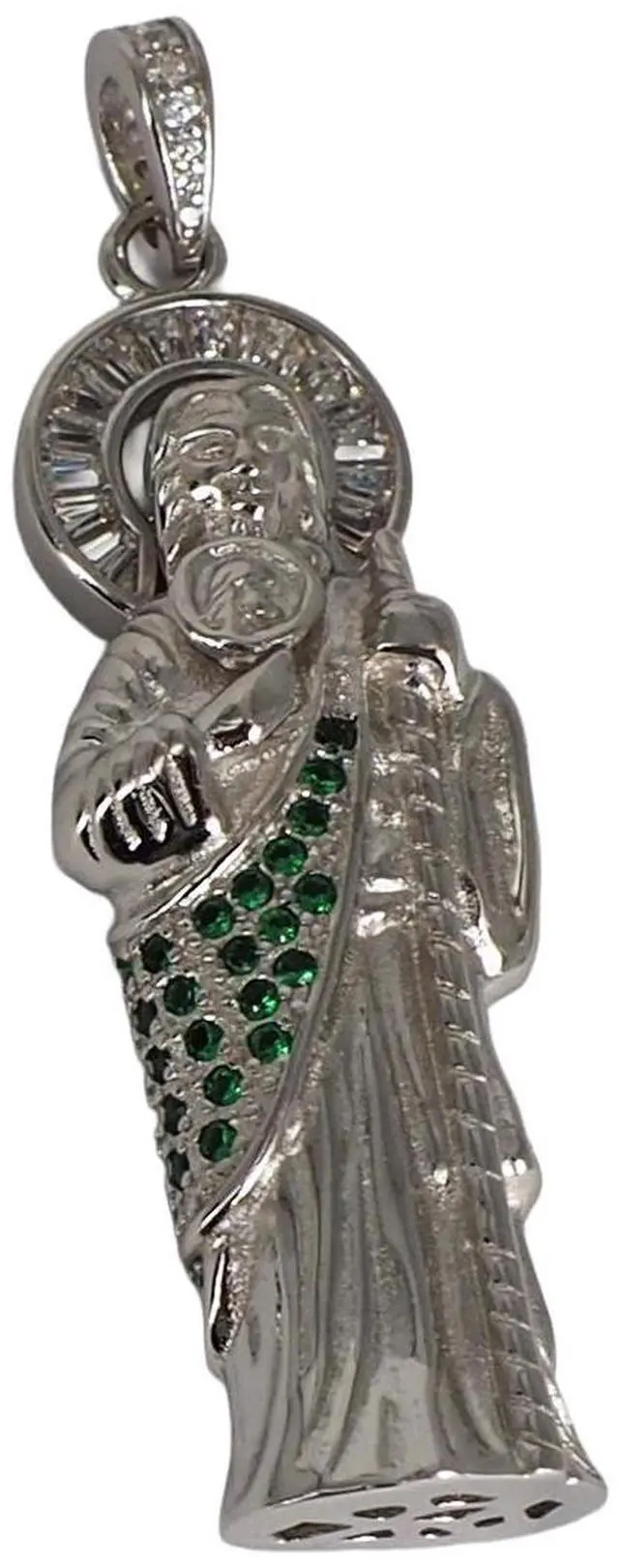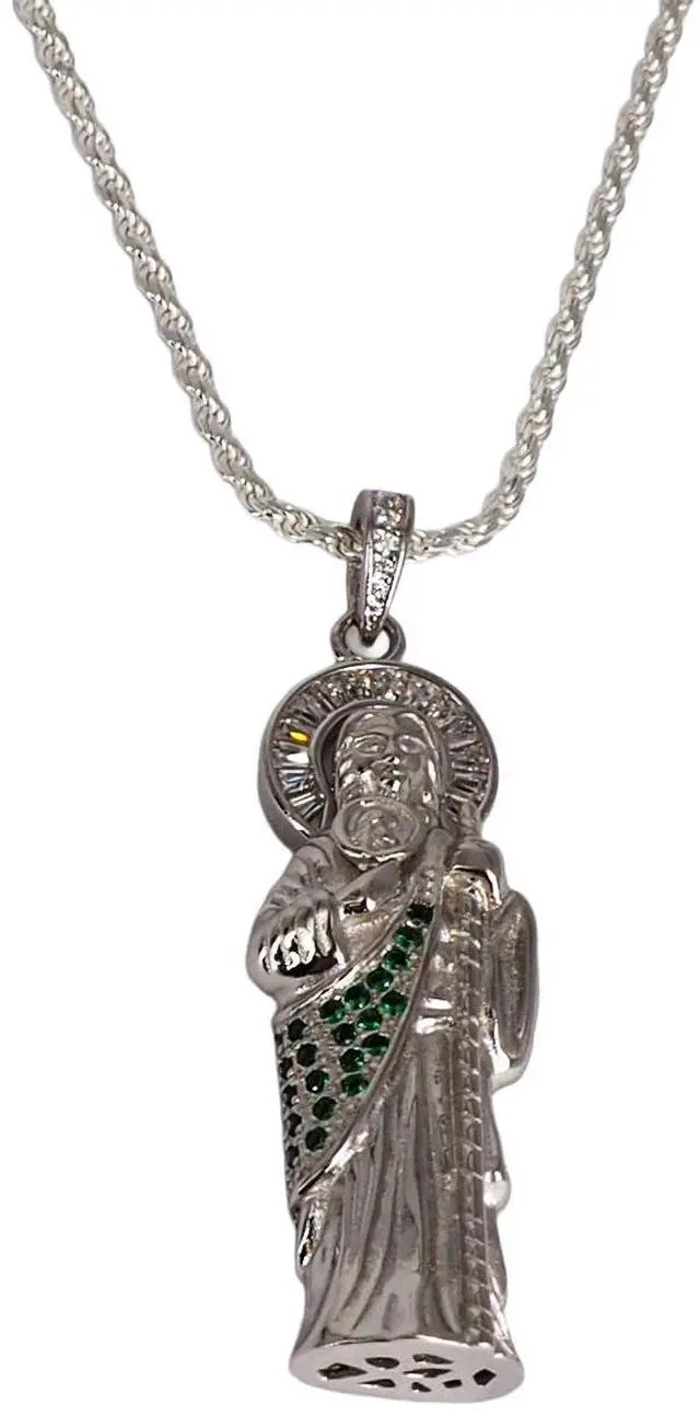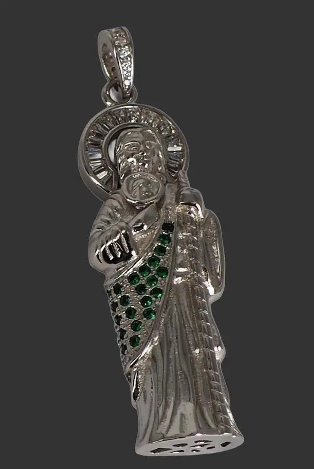 MST 925 Sterling Silver San Judas (Saint Jude) 3D Pendant Necklace with Green Emerald & Baguette CZ, Made in Italy, Unisex, All Ages Show your faith in elegance with this MST 925 Sterling Silver San Judas (Saint Jude) 3D Pendant Necklace, beautifully plated in. Expertly crafted in Italy, the pendant features sparkling clear baguette Cubic Zirconia and vibrant green emerald Cubic Zirconia, combining intricate detail with lasting brilliance. Features: Material: 925 Sterling Silver Pendant Height: 54 mm Approximate Weight: 12 grams 3D design adorned with clear baguette cubic zirconia and green emerald Cubic Zirconia Made in Italy Hypoallergenic, nickel-free, and anti-tarnish for long-lasting shine and comfort Stamped and guaranteed authentic Comes beautifully packaged in an elegant gift box Chain sold separately Perfect for men and women, this pendant is a meaningful statement of faith and Italian craftsmanship, ideal for everyday wear or gifting.