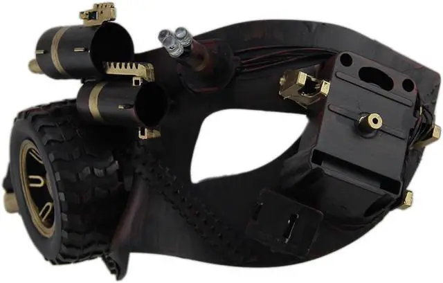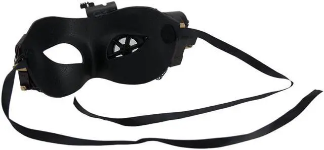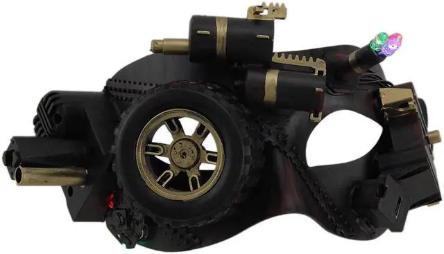 The detailed metallic finish, decorated with tire tracks, various mechanical parts, and a tire over the right eye, is a cool prop, capable of giving any Halloween costume a proper steampunk or dieselpunk edge to it. There is no need for makeup or face paint with this mask, making it easier to get out the door and onto the cosplay. Red, green, and blue LED lights that pulse and strobe make this accessory stand out in a crowd! The right eye LEDs flash and the LEDs near the left eye flash in fast, slow, and fade modes with the push switch on the side, and six AG13 button cell batteries are included! It's made of flexible and lightweight resin, and the silken ribbon ties help ensure a comfortable fit.