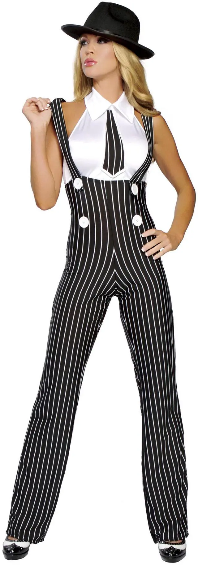 This 2Pc Gangsta Mama Costume includes ultra high waist pants with suspenders and button detailing and top with collar and pin stripe tie.