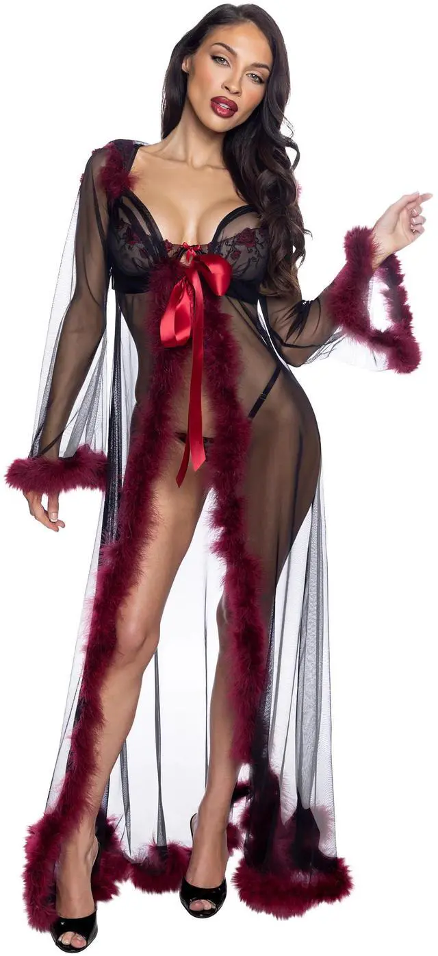 - Mesh body and hood - Contrast marabou trim - Satin sash - Floor length