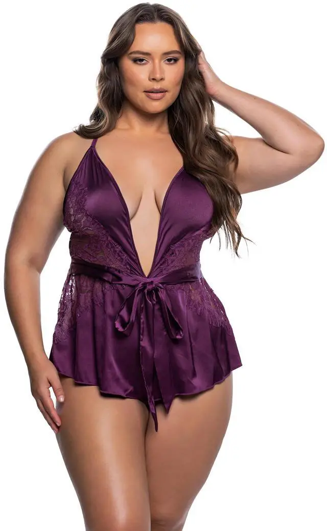 - Stretch satin and floral stretch eyelash lace - Plunge neckline - Adjustable back straps - Flared short - Adjustable waist sash