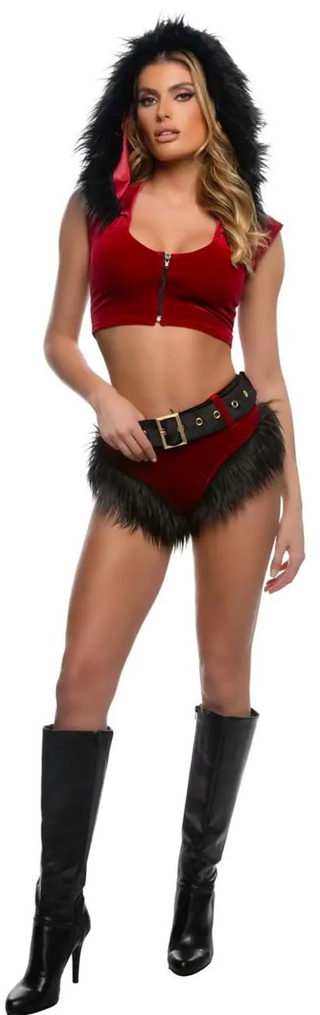 • Includes: Velvet and faux fur hooded cropped top, Brazilian cut shorts and faux leather belt