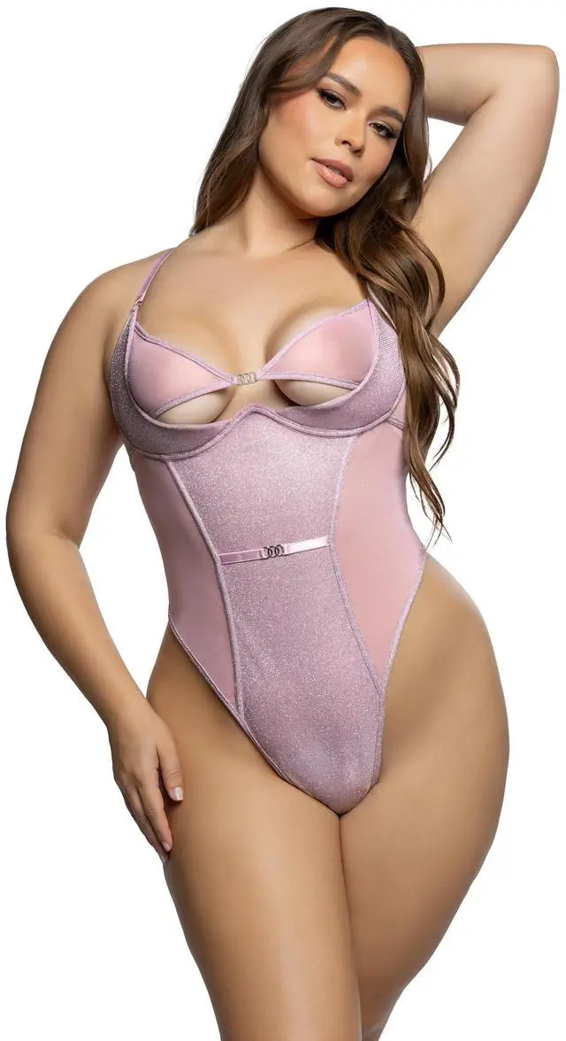 Lurex yarn knit and metallic shimmermesh, Keyhole demi cup withunderwire, O-ring hardware, Hook &eye closure, Single string thong back, Cotton gusset