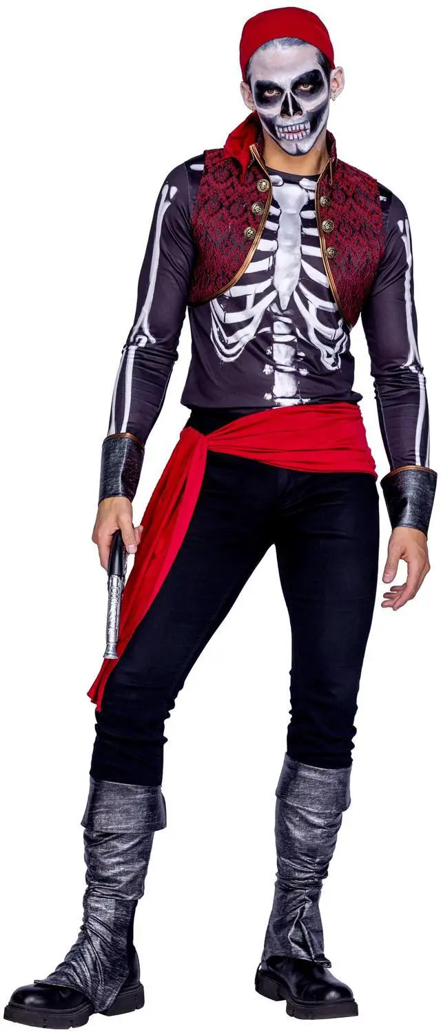 Includes Head Scarf, Brocade Vest, Skeleton Printed Shirt, and Sash