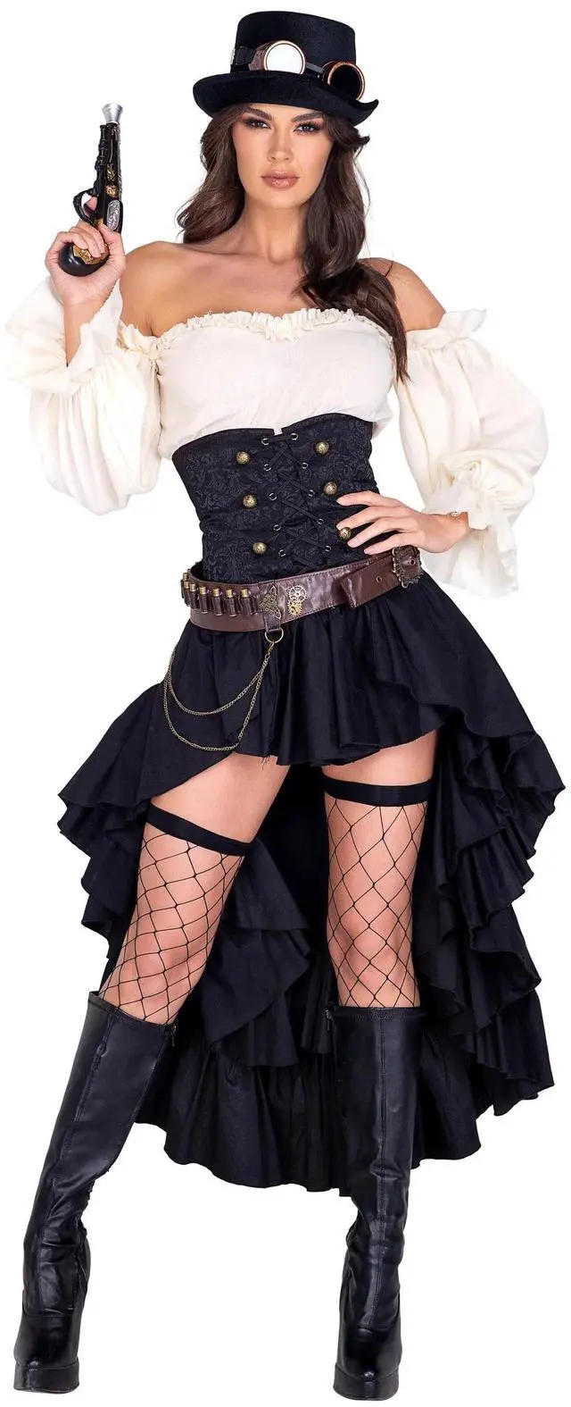 Includes Hat, Goggles, Cropped Top with Sleeves, Waist-Cincher Attached Ruffled Skirt, Belt & Gun
