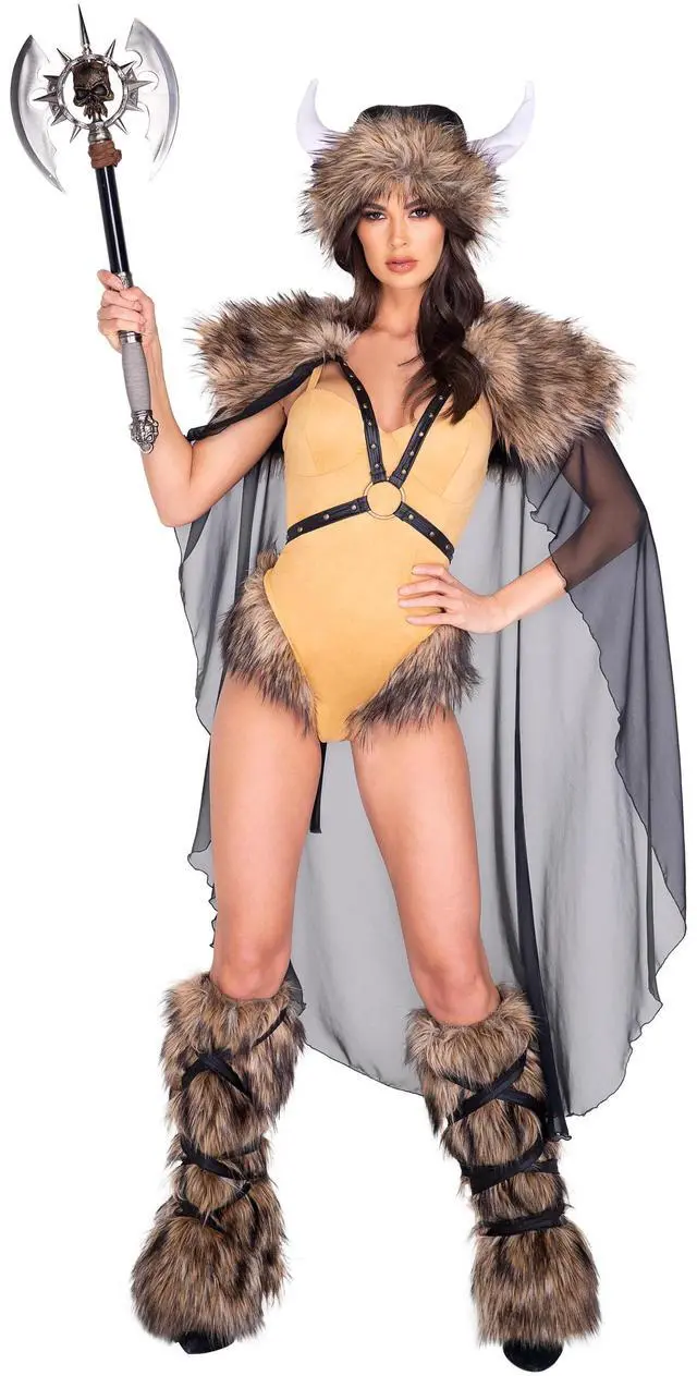 Includes Suede Romper with Faux Fur Trim, Harness Attached Cape, & Faux Fur Viking Helmet
