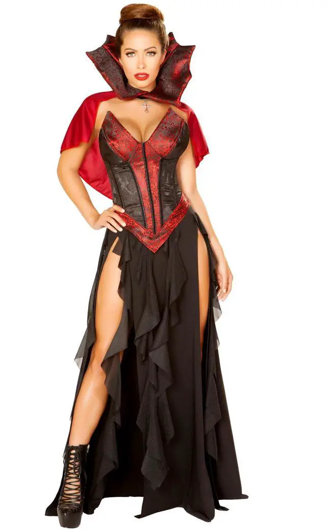 Includes Lace-Up Padded Corset, Double Slit Skirt with Ruffle, & Collar Cape