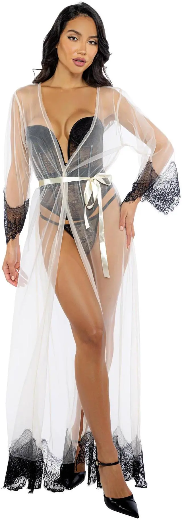 • Scalloped eyelash lace and mesh, Satin waist sash, Plunge neckline