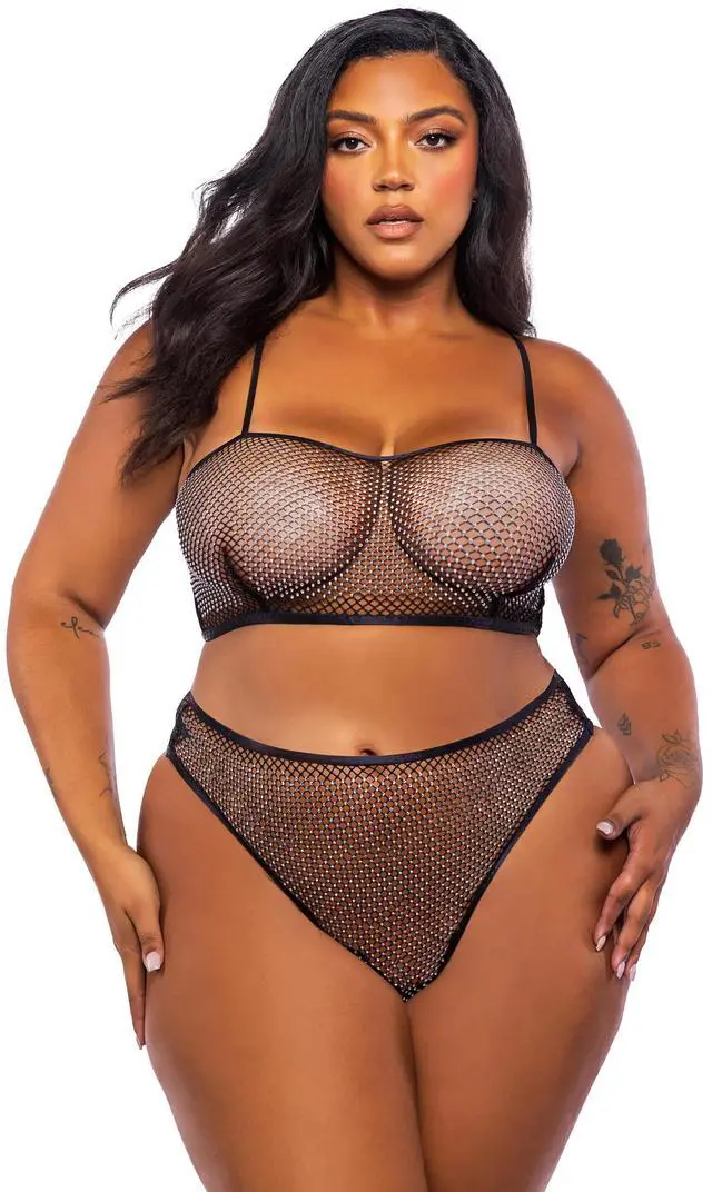 • Bralette : Plunge neckline, Rhinestone fishnet, Fold over elastic trim