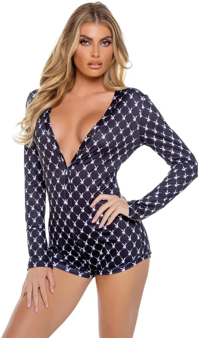 Roma Costume Play Bunny Cozy Lounge Romper, Black, S/M