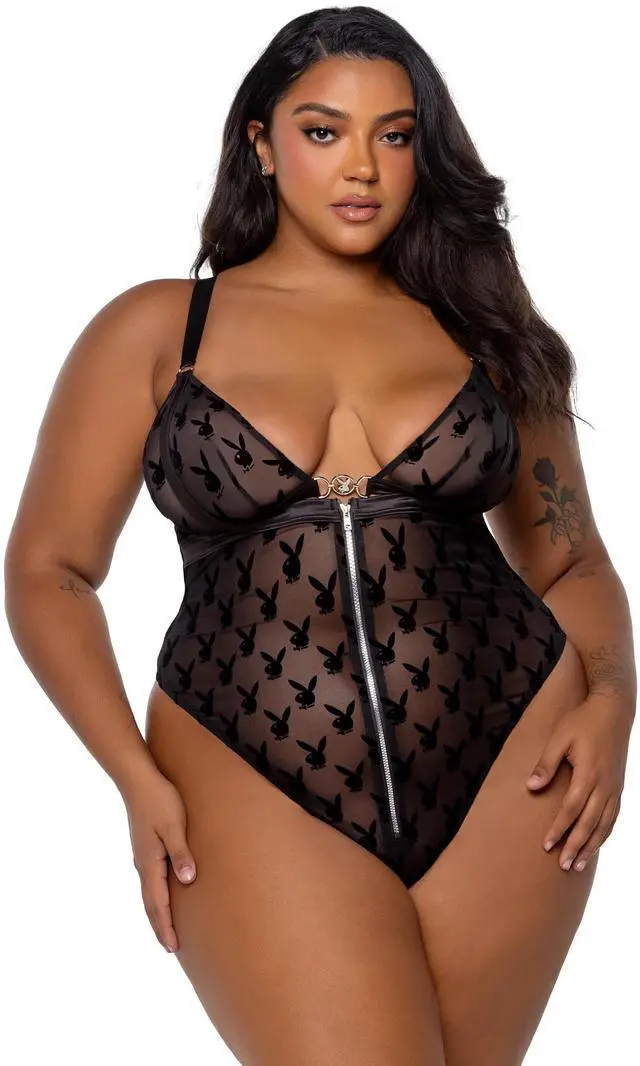 TEDDY: Play bunny logo flocked printed mesh satin trim, Plunge neckline, Bunny logo hardware zipper detail, Thong back, Cotton gusset