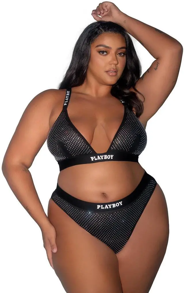 BRALETTE: All over rhinestone spandex cups, Play logo elastic, S-Hook Closure