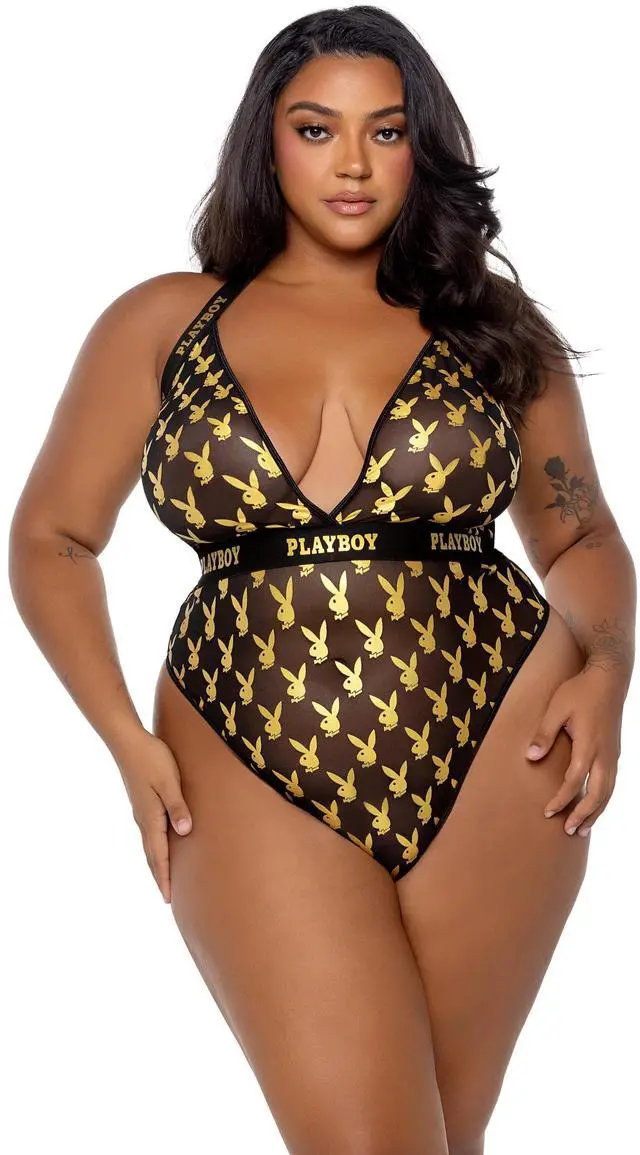 Roma Costume Play Foiled Bunny Teddy, Black/Gold, 1X