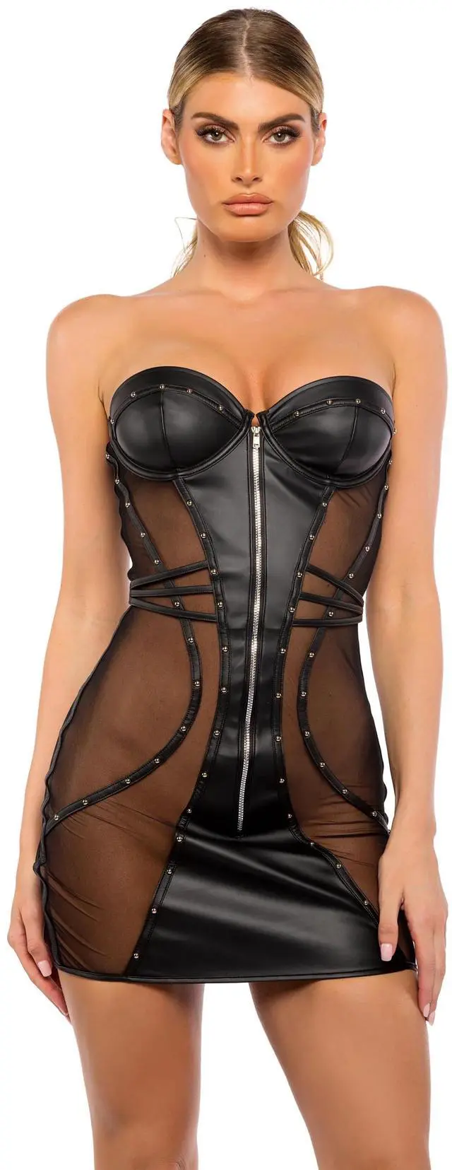 Vegan leather and mesh, Balconette cup with underwire, Metal stud and zipper detail, Waist cincher straps