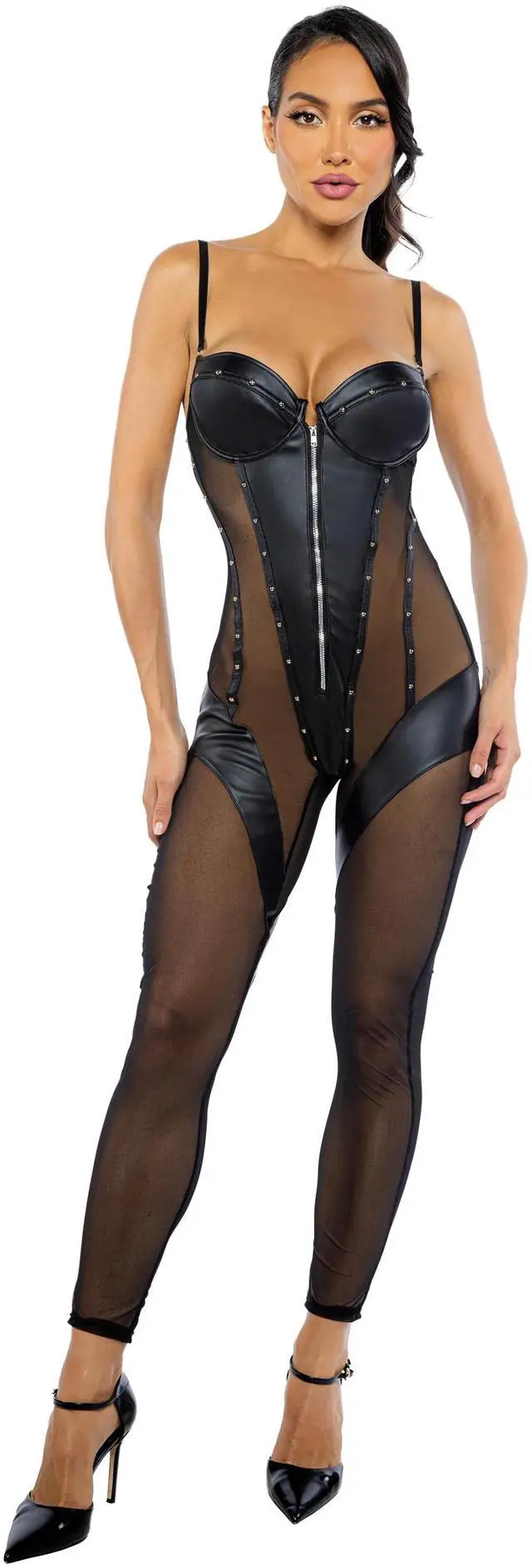 Vegan leather and mesh, Balconette cup with underwire, Metal stud and zipper detail, Â Keyhole back, Hook and eye closure