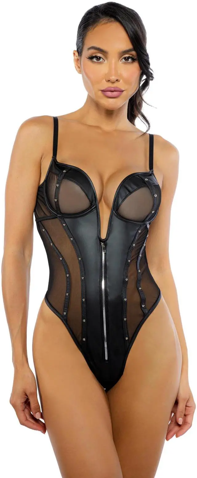 Vegan leather and mesh, Plunge v-wire, Balconette cup with underwire, Metal stud and zipper detail, Hook and eye closure, Thong back