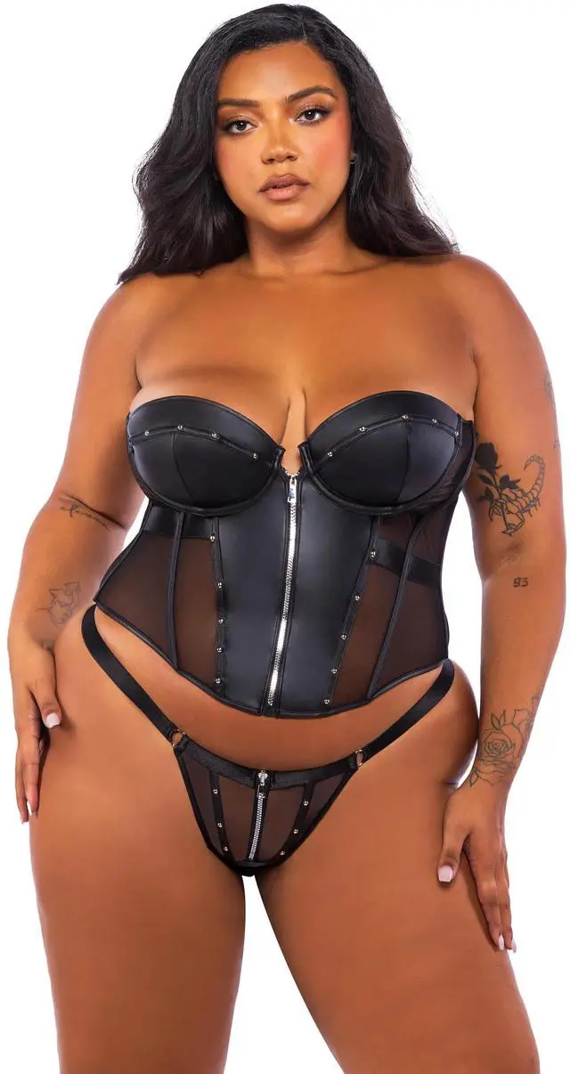 Corset: Vegan leather and mesh, Balconette cup with underwire, Metal stud and zipper detail, Steel boning, Lace-up back Thong: Vegan leather and mesh, Metal stud and zipper detail, Single string thong back