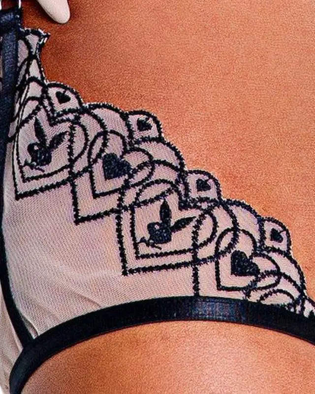 • Thong: - Play bunny logo heart embroidered tulle stretch satin - Single string thong back - Cotton gusset